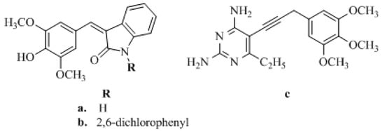 In turn, the most successful inhibitor of bacterial DHFR is trimethoprim (TMP) [2,4-diamino-5-(3,4,5-trimethoxybenzyl) pyrimidine] (Figure 1), which is a synthetic, broad-spectrum antimicrobial agent [22]. It is mainly used in the treatment of initial episodes of uncomplicated symptomatic urinary tract infections, both alone and in combination with a sulfonamide (e.g., sulfamethoxazole, sulfadiazine, sulfamoxole) [23]. TMP is a pyrimidine antifolate drug, which exerts antimicrobial activity by blocking the reduction of dihydrofolate to tetrahydrofolate, the active form of folic acid, by susceptible organisms [2,24,25]. One of our reviews presents an extensive range of research literature on the first and most recent achievements in TMP analogs as DHFR inhibitors and underlines new directions in developing and modeling DHFR inhibitors [26]. This literature analysis confirms that there are only a few reports showing the anticancer activity of TMP analogs. Singh et al. [27] modified the antibacterial agent TMP to compounds a and b (Figure 2), with promising anticancer applications. These two compounds had significant tumor growth inhibitory activities over 60 human tumor cell lines and exhibited appreciable interactions with DHFR [27]. Algul et al. [28] developed a new nonclassical series of propargyl-linked DHFR inhibitors. It was observed that interactions of propargyl-linked inhibitor (compound c) (Figure 2) with Leu22, Thr56, Ser59, Ile60 could potently inhibit human DHFR (hDHFR) in contrast to the weak inhibition of hDHFR by TMP.