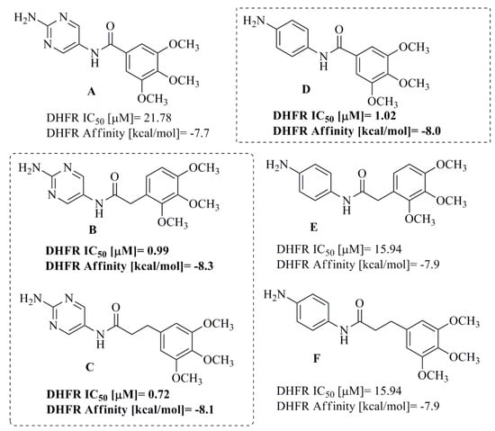 In our previous study, we reported the design and synthesis of a novel series of TMP analogs (A–F) (Figure 3) containing amide bonds as novel DHFR inhibitors and candidates for antitumor drugs [43]. Compounds B–C and E were selected as the most active members of this study because they exhibited higher activity against the DHFR enzyme and higher binding affinity than standard TMP. Moreover, analogs B,C, and E were characterized by a higher binding strength to pBR322 plasmid.