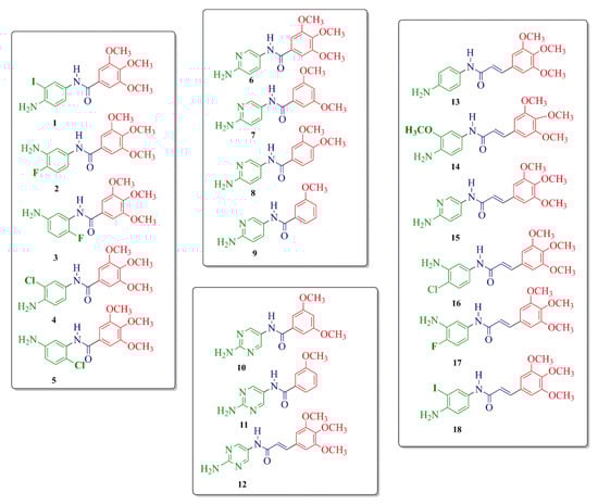 Seven derivatives (2, 6, 13–14, and 16–18) showed the best inhibitory properties against hDHFR with IC50 values ranging from 0.88 to 2.09 µM. These biological results could be analyzed on the basis of the type of ring (benzene, pyrimidine, pyridine), position on the benzene ring, the nature of the substituents: -I, -Cl, -F, -NH2, -OCH3, and the influence of the length of the carbon chain between the two aromatic rings. All of the synthesized TMP analogs have an amide bond incorporated between two aromatic rings. Compound 16 bearing an amide and carbon–carbon double bond connecting the benzene ring (4′-Cl, 3′-NH2) and 3′,4′,5′-trimethoxybenzene ring exhibited the best inhibitory activity with IC50 = 0.88 µM. Compounds 13 (IC50 = 0.89 µM), 14 (IC50 = 0.97 µM), 17 (IC50 = 1.22 µM), and 18 (IC50 = 2.09 µM), also containing carbon–carbon double bonds connecting two aromatic rings, presented similar behavior in biological activity. In addition, similar biological results were obtained for analog 2, bearing a benzene ring (4′-F, 3′-NH2) and 6 with a pyridine ring connected by an amide bond in place of a methylene bridge to the 3′,4′,5′-trimethoxybenzene ring, with IC50 = 1.11 µM and 0.99 µM, respectively.
