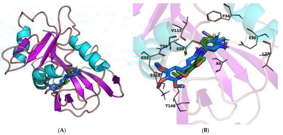Derivatives 2, 6, 13, 14, and 16 were found to be the most potent inhibitors, both in the experiment and the molecular docking study (Table 1). Therefore, further analysis will concern only these molecules. It is worth mentioning that binding modes, concerning molecules with the same molecular scaffold (2, 6 and 13, 14, 16), are nearly identical and their interactions with residues in the protein’s active site are also very similar. These modes differ from one another by substituents and overlap with each other in our molecular docking study (Figure 5).