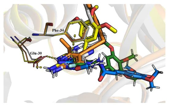 Superimposed crystal structures of hDHFR-inhibitor complexes from X-ray diffraction experiments. Polar hydrogen atoms have been added. MTX binding position (PDB: 1U72) [53] is in white, TMP (PDB: 2W3A) [54] is yellow, and orange is one of the propargyl-linked antifolate inhibitors (PDB: 4KD7) reported in work of Lamb et al. [55]. Our inhibitors 2 (green) and 14 (blue) are also shown. Interactions with Glu-30 and Phe-34 are highlighted.