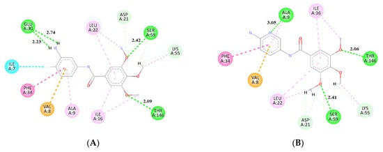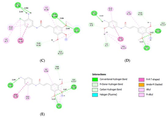 The effect of fewer methoxy substituents in the trimethoxybenzene ring (molecules 6–11) was tested. We found that the more methoxy groups connected to the ring the better the results. Methoxy groups are involved in many interactions within the active site pocket of the studied protein as a hydrogen bond acceptor. Moreover, many TMP derivatives showing considerable antimicrobial activity contain the trimethoxybenzene group [28,43,56]. The addition of halogen atoms as substituents (-F,-Cl,-I) in the benzene ring was studied as well, for molecules 1–5 and 16–18. Since there was only one halogen bonding interaction observed (Figure 7a), their effect on the binding energy is considered negligible. The amide group plays an important role in binding of the ligand, but also elongates the chain between two aromatic rings, which makes interaction with positively charged Lys-55 possible. It is involved in numerous interactions with trimethoxybenzene rings (Figure 7c–e). Generally, it can be said that the results from molecular docking are in accordance with the experimental data. Two groups of derivatives had especially high inhibition activity: 13, 14, 16, 17, 18, and 2, 6, which qualifies them as potential anticancer agents.