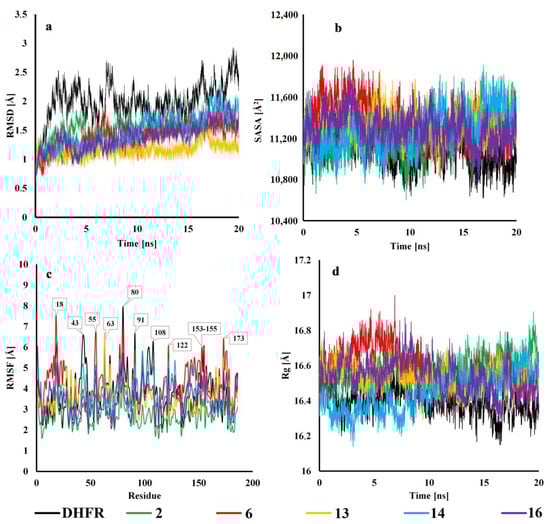 Derivatives 2, 6, 13, 14, and 16 proved to be the most potent inhibitors, both in the DHFR inhibition experiment and the molecular docking study. Hence, they were selected for further investigation. The results from Root Mean Square Deviation (RMSD) analysis showed that all the tested inhibitors have a tendency to lower this value compared to DHFR during the entire simulation, thus indicating that all of them have a stabilizing effect on hDHFR. Derivative 13 was found to have the greatest impact on protein stabilization, with RMSD oscillating around 1.1 Å for the whole 20 ns run. The only slight fluctuation was from 15–17 ns when it increased to 1.5 Å (Figure 8a). Compounds 2 and 6 exhibited the highest RMSD values during the first 10 ns, after that they stabilized at a level similar to the rest of the tested molecules. Derivative 14 showed growth in the RMSD value during the last 10 ns, which was also the case for 16, but on a smaller scale. The RMSD value averaged over 20 ns was 1.994, 1.505, 1.395, 1.161, 1.483, and 1.394 for DHFR, 2, 6, 13, 14, and 16, respectively.