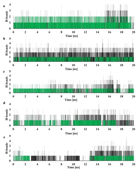 Number of H-bonds detected during 20 ns molecular dynamics simulation for (a) 2, (b) 6, (c) 13, (d) 14, and (e) 16. Cut-off distance for H-bonds was set to 3.2 Å and 30° angle. Green indicates interactions with Glu-30.