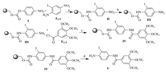 For the TMP derivatives preparation procedure, aromatic amino-nitro compounds A1–9 and selected acid chlorides E1–5 were used as substrates to obtain 18 novel TMP analogs containing an amide bond, as shown in Figure 4. Compounds with the structure II were obtained according to the reported procedure [46] from p-nitrophenyl carbonate Wang resin I, as shown in Scheme 1. After grafting the nitroamines to the resin, reduction of the nitro group of structure II was carried out using tin (II) chloride dihydrate in DMF. Acylation of 1–9 resin-bound amines III, using E1–5 chlorides in the presence of DMAP in methylene chloride at room temperature produced the resin-bound nitro compounds with structure IV. Cleavage by 95% trifluoroacetic acid in dichloromethane gave a satisfactory yeld of the desired compounds with structure V. The structures of compounds A1–9, acid chlorides E1–5, the analytical and spectrometric data are presented in Table S1 (Supplementary Materials).