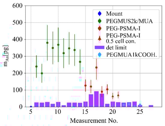 The uptake results are shown in Figure 1, where the highest gold uptake of 300 to 450 pg within the X-ray beam volume was found for the AuNPs coated with a PEGMUA2k/MUA, 100 to 150 pg in the case of the PEG-PSMA-I functionalization, with the sample containing half the cell concentration also showing significantly lower gold intake, and below detection limits in the case of the PEGMUA1kCOOH-coated AuNPs. Hereby, PC3 cells had been incubated for 16 h with AuNPs at 12.5 nM NP concentration, which is equivalent to a gold concentration of 0.13 mg/mL. For details of the cell culture procedures and concentration calculations, we refer to the Supplementary Materials. The observation that uptake is higher for PEGMUA2k/MUA than for the PEG-PSMA-I functionalized nanoparticles points to the fact that the results of uptake experiments have to be interpreted with care. The fact that no PEGMUA1kCOOH coated nanoparticles were found to be internalized can most likely be explained by the effect of PEG. However, the focus of the present manuscript is towards benchmarking the technical features of XFI for detecting AuNPs in cells, and a detailed discussion relating the uptake of AuNPs to their different physicochemical properties [] would be out of the scope of this study. To put our work, however, into the context of standard NP uptake studies, complementary cell uptake experiments, including a full data set obtained with ICP-MS, are also discussed in the Supplementary Materials.