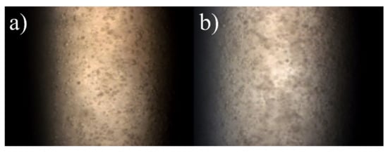 Microscopy image of a capillary with a cell concentration of (a) 0.5×107 cells/mL, and (b) 1×107 cells/mL.