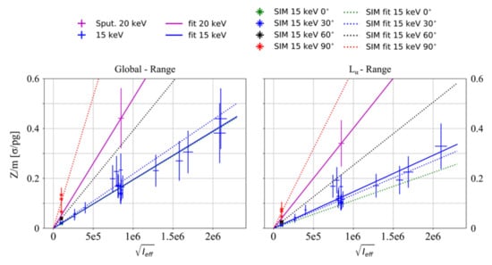 Significance[σ] per gold mass [pg] (i.e., total mass in beam-probe intersection) plotted over the root of effective incident photons for experimental and simulated data. Left: Lα and Lβ gold fluorescence regions were considered. Right: only Lα on data is shown.