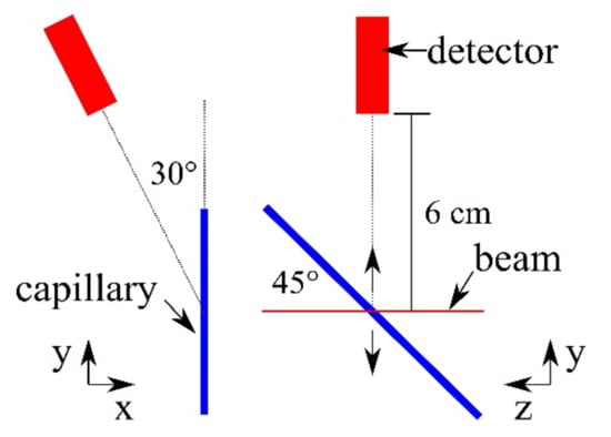 Scanning positions changed vertically to ensure different cells being probed per individual measurement. The Hitachi Vortex-EM detector was positioned at 30° from the vertical axis and at 6 cm distance from the probe-beam intersection (Figure 5). The P11 beamline at PETRA III is dedicated to macromolecular crystallography experiments, and the standard beamline setup did not allow for another angular detector placement []. Before the target, the beam is shaped by a 200 µm pinhole, and a few mm behind the target the beam is dumped. For later gold mass reconstruction, a 20.4 nm gold layer on a 1 mm thick silicon waver was used as a reference target.