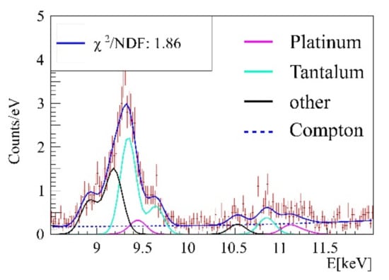 Furthermore, an ideal overlap is not expected because the L-shell peaks are located on a mostly flat plateau, which is imitated artificially (see Section 4.4). An agreement between simulation and experimental data is still expected. On the other hand, the Lβ-line already experiences the flank of the Compton peak, hence, a flat plateau is not a perfect approximation. Thus, the background is probably underestimated in the simulations, which yield a higher sensitivity. These effects explain the differing behavior of simulations in Figure 3.