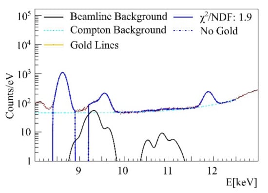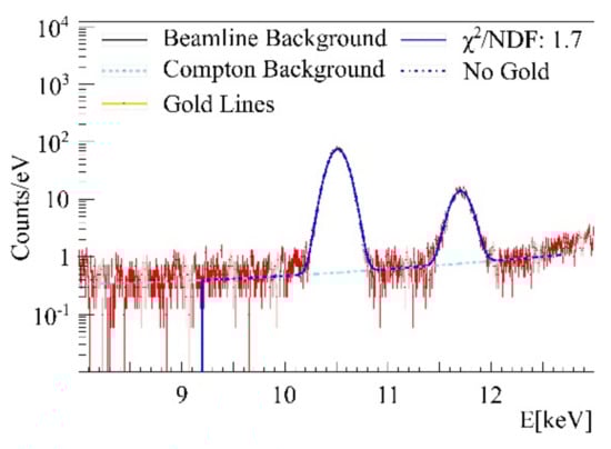 The energy region between 2 and 14 keV is prone to multiple background peaks, as light-element K-shell and heavy-element L-shell fluorescence occur in this region. To yield high sensitivity measurements, background caused by surrounding beamline components or the target itself needs to be addressed in background fit functions. To this purpose, a zero measurement without any target and a phantom measurement containing cells without treatment and agarose only were performed. The beamline intrinsic beamstop and pinhole had a visible impact on the gold L-shell region (energies between 8 and 13 keV), since they caused fluorescence of tantalum and platinum, whose peaks can be seen in Figure 6.