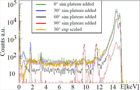 Angle variation spectra and scaled experimental spectra were compared, see Figure 10. Detector placement angles of 0°, 30°, 60°, and 90° were simulated where 90° means placing the detector in the plane of primary photon polarization, which reduces the background in the gold L-shell fluorescence region between 8 and 13 keV significantly. While a change to 60° does decrease the background by a factor of 2, almost two magnitudes in background reduction can be gained if optimal detector angles are chosen. A background decrease of two orders of magnitudes would increase the signal significance by a factor of 10. Furthermore, the overall count rate is similarly suppressed, reducing detector dead time and hence allowing for a smaller detector-target distance to reduce the overall measurement time.