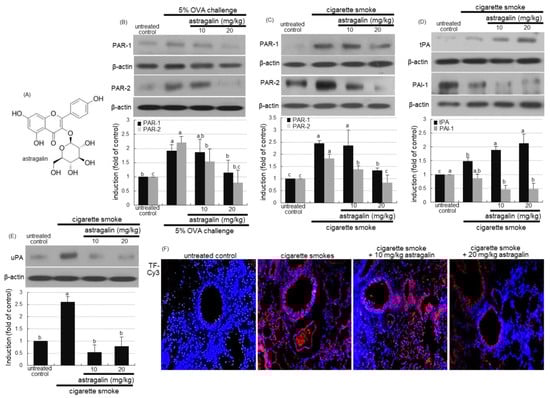 Chemical structure (A) and inhibition of induction of protease-activated receptor (PAR) proteins (B,C) and plasminogen activator proteins (tPA and uPA) and plasminogen activator inhibitor-1(PAI-1, (D,E)) by astragalin in lung tissues of ovalbumin (OVA)- or cigarette smoke-exposed mice. Mice were orally administrated with 10 or 20 mg/kg astragalin and exposed to cigarette smoke. Additionally, BALB/c mice were OVA-sensitized and orally supplemented with 10–20 mg/kg astragalin (B). Tissue extracts were subject to Western blot with a primary antibody against PAR-1, PAR-2, tPA, PAI-1 or uPA (B–E). β-Actin protein was used as an internal control. The bar graphs (mean ± SEM, n = 3) represent quantitative results of the upper bands obtained from a densitometer. Values in bar graphs (same achromatic colored) not sharing the same lower case alphabet letter indicate a significant difference at p < 0.05. The tissue factor (TF) localization was identified as Cy3-red staining in mouse lungs exposed to cigarette smoke (F). Nuclear staining was done with 4′,6-diamidino-2-phenylindole (blue). Each photograph is representative of four mice. Magnification: 200-fold.