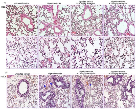 Suppressive effects of astragalin on airway injury (A) and thrombus formation (B) in airways and alveoli of cigarette smoke-exposed mice. Mice were orally administrated with 10 or 20 mg/kg astragalin and exposed to cigarette smoke. Histological examination was performed with phospho-tungstic acid hematoxylin (PTAH) and hematoxylin and eosin (H&E) staining. Tissue sections of small airways and alveoli were stained by using H&E reagent (A). PTAH staining showing blockade of thrombus by oral administration of astragalin in lung blood vessels of cigarette smoke-exposed mice (B). The blue arrows indicate thrombus formation. Each photograph is representative of four mice. Magnification: 200-fold.