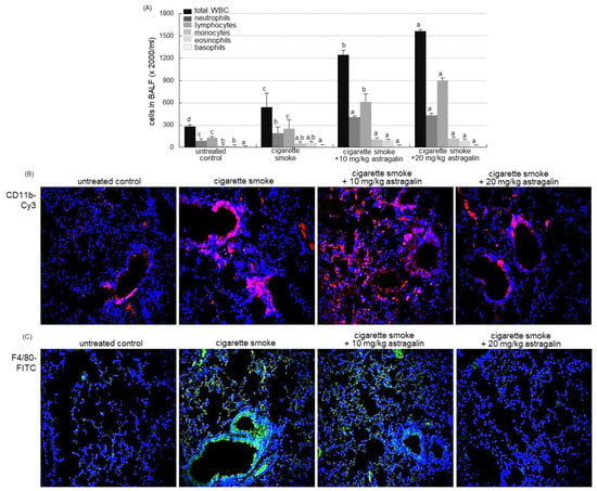Contents of inflammatory cells in the bronchoalveolar lavage fluid (BALF, (A)) and infiltration of inflammatory cells (B) in the lungs of mice exposed to cigarette smoke. Mice were orally administrated with 10 or 20 mg/kg astragalin and exposed to cigarette smoke. Cells in BALF were counted using a Hemavet HV950 multispecies hematologic analyzer (A). Values in bar graphs (same achromatic colored) not sharing the same lower case alphabet letter indicate a significant difference at p < 0.05. For the measurement of levels of CD11b and F4/80 in mouse airways exposed to cigarette smoke, the CD11b was visualized with Cy3-red staining (B), and the F4/80 localization was identified as FITC-green staining (C). Nuclear staining was done with 4′,6-diamidino-2-phenylindole (blue). Each photograph is representative of four mice. Magnification: 200-fold.