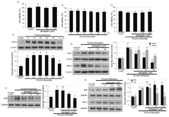 This study attempted to investigate that thrombi in vessels were involved in evoking alveolar inflammation, which was attenuated by treating astragalin. No alterations were observed in cell viability when either 1–20 μM astragalin or 10 U/mL thrombin was solely treated to A549 cells for 72 h (Figure 4A,B). In addition, 1–20 μM astragalin did not show cytotoxicity even in combination with 10 U/mL thrombin (Figure 4C). When 10 U/mL thrombin was loaded to A549 cells, the cellular expression of PAR-2 was highly induced up to 60 h (Figure 4D). In contrast, 20 μM astragalin diminished thrombin-induced induction of both PAR-1 and PAR-2 (Figure 4E). Cellular uPA was induced in thrombin-loaded alveolar cells, which was attenuated by submicromolar astragalin (Figure 4F). Thrombin influenced the expression of tPA and PAI-1 reciprocally (Figure 4G). The tPA expression by thrombin was further induced, but the PAI-1 expression was dose-dependently diminished by treating 1–20 μM astragalin (Figure 4G).