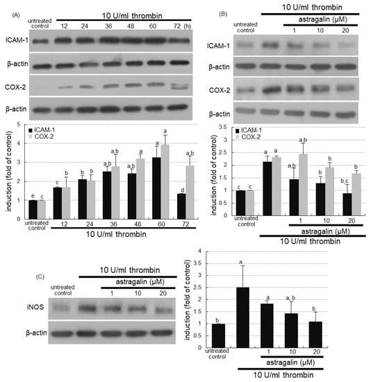 Temporal induction of alveolar inflammatory mediators by thrombin (A) and blockade of their induction by astragalin in thrombin-treated A549 cells (B,C). Alveolar epithelial cells were incubated in media containing 10 U/mL thrombin in the absence and presence of 1–20 μM astragalin for up to 72 h. Cell lysates were subject to Western blot analysis with a primary antibody against ICAM-1, COX-2, or iNOS. β-Actin protein was used as an internal control. The bar graphs (mean ± SEM, n = 3) represent quantitative results of the upper or left bands obtained from a densitometer. Values in bar graphs (same achromatic colored) not sharing the same lower case alphabet letter indicate a significant difference at p < 0.05.