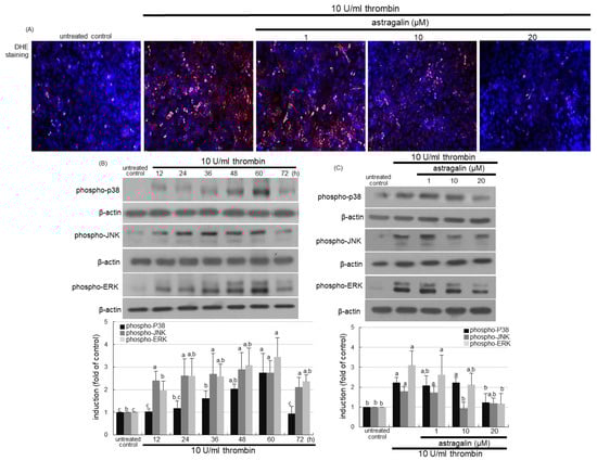 Inhibition of oxidant production (A), temporal activation of mitogen-activated protein kinase (MAPK) signaling (B) and their inhibition (C) by astragalin in thrombin-treated A549 cells. Alveolar epithelial cells were incubated in media containing 10 U/mL thrombin in the absence and presence of 1–20 μM astragalin for up to 72 h. For the measurement of the reactive oxygen species production, dihydroethidium (DHE) staining was conducted in thrombin-treated A549 cells (A). Nuclear staining was done with 4′,6-diamidino-2-phenylindole (blue). Each photograph is representative of stained cells. Magnification: 200-fold. Cell lysates were subject to Western blot analysis with a primary antibody against phospho-p38, phospho-c-Jun N-terminal kinase (JNK) or phospho-extracellular signal-regulated kinases (ERK) (B,C). β-Actin protein was used as an internal control. The bar graphs (mean ± SEM, n = 3) represent quantitative results of the upper bands obtained from a densitometer. Values in bar graphs (same achromatic colored) not sharing the same lower case alphabet letter indicate a significant difference at p < 0.05.