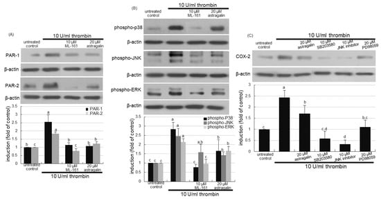 Inhibition of activation mitogen-activated protein kinase (MAPK) by protease-activated receptor (PAR) inhibitor (A,B), and cyclooxygenase (COX)-2 inhibition by MAPK inhibitors (C) in thrombin-treated A549 cells. Alveolar epithelial cells were incubated in media containing 10 U/mL thrombin in the presence of 10 μM ML-161, 20 μM astragalin, or 10–20 μM MAPK inhibitors for up to 72 h. Cell lysates were subject to Western blot analysis with a primary antibody against PAR-1, PAR-2, phospho-p38, phospho-c-Jun N-terminal kinase (JNK), phospho-extracellular signal-regulated kinases (ERK) or COX-2. β-Actin protein was used as an internal control. The bar graphs (mean ± SEM, n = 3) represent quantitative results of the upper bands obtained from a densitometer. Values in bar graphs (same achromatic colored) not sharing the same lower case alphabet letter indicate a significant difference at p < 0.05.