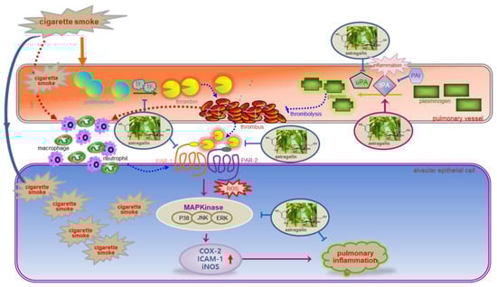 Eight major findings were extracted from this study. (1) The OVA sensitization and cigarette smoking-induced the expression of PAR-1 and PAR-2 in lung tissues, which was attenuated by the administration of ≥10 mg/kg astragalin. (2) The oral supplementation of ≥10 mg/kg astragalin to cigarette smoke-exposed mice attenuated the protein induction of uPA, PAI-1and TF and instead enhanced the induction of tPA in lung tissues. (3) The astragalin treatment alleviated cigarette smoke-induced lung emphysema and pulmonary thrombosis. (4) Astragalin caused lymphocytosis and neutrophilia in BALF due to cigarette smoke but curtailed infiltration of neutrophils and macrophages in airways. (5) Submicromolar astragalin diminished the thrombin induction of PAR proteins in alveolar cells. (6) Astragalin dampened alveolar inflammation by inhibiting the expression of ICAM-1, COX-2 and iNOS induced by thrombin. (7) Treating astragalin attenuated the ROS production in thrombin-exposed alveolar cells. (8) Astragalin interrupted PAR proteins-activated MAPK signaling leading to alveolar inflammation. Accordingly, astragalin may inhibit smoking-induced oxidative stress and block the MAPK signaling–inflammation axis via disconnection between alveolar PAR activation and pulmonary thromboembolism (Figure 8).