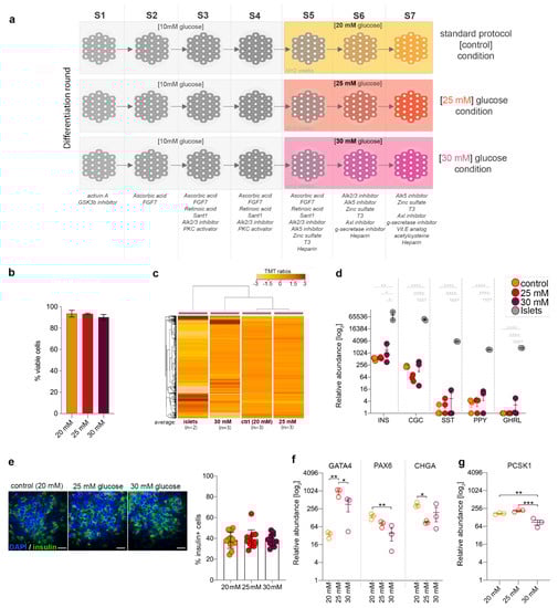 Briefly, three distinct hiPSC colonies were differentiated during three distinct differentiating rounds as previously described [,]. Starting at the pancreatic progenitor stage (stage 5), cells were exposed to the appropriate differentiation cocktail containing either the protocol “standard” 20 mM glucose (standardly elevated) or higher glucose levels of 25 (mildly increased) and 30 mM (highly increased) (Figure 1a). Of note, the term “standard” will be further used to designate the standard, but not physiological, concentration required in the differentiation protocol and does not refer to “standard physiological conditions”.