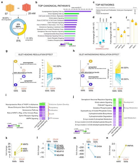 Pathway analysis of 25 mM glucose concentration effect. (a) Analysis workflow depicting the comparison employed. (b) Top canonical pathways with predicted regulation and (c) top networks characterizing the 25 mM glucose condition. (d) Selected dysregulated islet markers. (e) Selected differentially expressed developmental markers of pancreas development. (f) Graph of the observed downregulated WNT1 and WNT3 ligands in 25 mM glucose condition. (g) Scheme depicting the selection strategy and number of proteins displaying a dynamic of regulations compatible with an islet-heading or (h) an islet-antagonizing regulatory pattern in response to 25 mM glucose. Arrows represent the generic mandatory direction of regulation for inclusion in each respective subgroup. (i,j) Ingenuity Pathway Analysis (IPA)-generated comparison analysis of the protein landscapes characterizing the overall 25 mM effect, islet-heading and islet-antagonizing regulatory subgroups. (k–n) Graphs showing representative markers following an islet-antagonizing regulation. * p < 0.05, ** p < 0.01, *** p < 0.001.