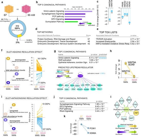 Pathway analysis of 30-mM glucose concentration effect. (a) Analysis workflow depicting the comparison employed. (b) Top canonical pathways with predicted regulation characterizing the 30-mM glucose condition. (c) Graphs of the observed downregulated WNT5A and WNT5B ligands and PAX6, MEIS2 (Meis homeobox 2), SUFU (suppressor of fused protein) and SOX9 (SRY-Box Transcription Factor 9) in the 30 mM glucose condition. (d) Top networks and (e) top tox list characterizing the proteome landscape of the 30 mM glucose condition. (f) Scheme depicting the selection strategy and number of proteins displaying a dynamic of regulations compatible with an islet-heading regulatory pattern in response to 30 mM glucose. (g) Top 3 canonical pathways and the network representation of one of the top predicted upstream regulators’ (Catenin Beta 1, CTNNB1) target molecules. (h) Graphs of WNT5A, WNT7A and SOX9 following an islet-heading regulation pattern. (i) Scheme depicting the selection strategy and number of proteins displaying a dynamic of regulations compatible with an islet-antagonizing regulatory pattern in response to 30 mM glucose. (j) Top 5 canonical pathways characterizing the subgroup of proteins displaying islet-antagonizing regulation. (k) Graphs of the β-cell markers PCSK1 and KDM6A (Lysine Demethylase 6A) presenting an islet-antagonizing regulation pattern. (l) IPA-generated network representations of selected dataset differentially expressed proteins (DEPs) characterizing the corresponding top disease and function processes. * p < 0.05, ** p < 0.01.