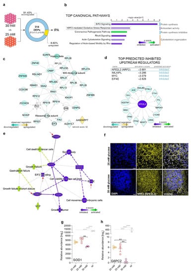 Direct comparison analysis between the proteome landscape of 30 and 25 mM glucose conditions. (a) Analysis workflow depicting the comparison employed. (b) Top canonical pathways with predicted regulation characterizing the differentially expressed protein landscape between 30 and 25 mM glucose conditions. (c) Selected top 2 organic networks displaying the observed downregulation of proteins involved in protein synthesis. (d) Top predicted activated upstream transcription regulators and the NFE2L2 (NRF2) target molecules observed regulated in the analyzed DEPs dataset. (e) IPA-generated global integration of all pathway analysis levels characterizing the differentially expressed protein landscape between 30 and 25 mM glucose conditions. (f) Confocal imaging of representative NRF2+ cells (yellow) in 25- and 30-mM-treated samples (Scale bar: 25 µm; blue–DAPI). (g) Relative abundance levels of superoxide dismutase 1 (SOD1) and (h) G6PC2 (Glucose-6-Phosphatase Catalytic Subunit 2) proteins (one-way ANOVA with Tukey’s multiple comparisons test, ** p < 0.01, **** p < 0.0001). Graphs are shown as mean ± SEM.