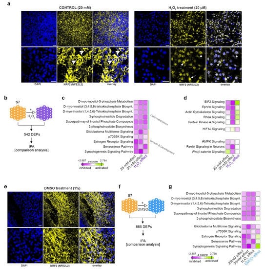 H2O2 and DMSO impact on differentiating pancreatic progenitors. (a) Confocal imaging of representative NRF2+ cells (yellow) in control (20 mM glucose) and H2O2-treated samples (Scale bar: 25 µm; blue–DAPI). (b) Scheme depicting the two conditions analyzed. (c) IPA-generated comparison analysis of the protein landscapes characterizing the 25 mM, 30 mM and H2O2 effects displaying similar or (d) dissimilar pathway regulation between the conditions analyzed. (e) Confocal imaging of representative NRF2+ cells (yellow) in control (20 mM glucose) and DMSO-treated samples (Scale bar: 25 µm; blue–DAPI). (f) Scheme depicting the conditions analyzed. (g) IPA-generated comparison analysis of the protein landscapes characterizing the 25 mM, 30 mM, H2O2 and DMSO effects.