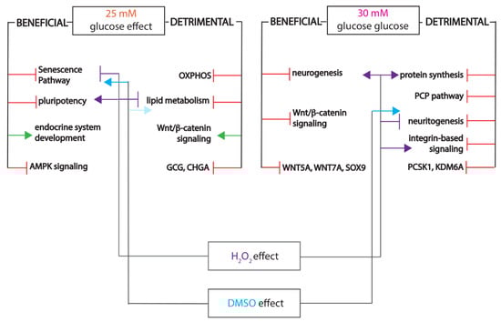 Integrative scheme depicting the beneficial and detrimental effects of elevated glucose levels, including superimposition of the H2O2 and DMSO treatments’ effects.