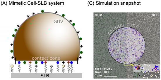 To simulate the growth of domains with multiple binding pairs, we extend a recently developed Monte Carlo scheme for modeling adhesion by a single ligand-receptor pair []. The original scheme was capable of modeling the surface of an entire vesicle (GUV) or a cell binding to a supported lipid bilayer (SLB), any other type of a flat substrate, or another cell (Figure 1A). Using the same setup, both the cell/vesicle as well as the SLB surfaces are represented by square lattices (edge-length a) where each individual protein occupies a single lattice site. The lattice constant is set by the typical size of a protein which can be few nanometers as in the case of 5–10 nm large integrins, 8–10 nm cadherins [] or 4–5 nm neutravidins [], but may also be significantly as in the case of about 40 nm large rhodopsins and other GPCRs, as stated in the Table 1. In the current simulations, we work with larger proteins but all the results scale with the lattice constant as described in previous work []. Consequently, it is relatively easy to convert data from one lattice to another.