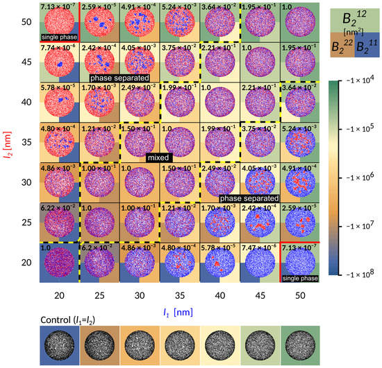 Contact zone for simulations with two types of ligand-receptor bonds of varying lengths as indicated on the axis, shown in red and blue. The axis labels are colored according to the bond type. Free binders are omitted for clarity. Besides the length, other characteristics of the bonds are identical and chosen to be , , . The other parameters are as indicated in the table in the Methods section. The background color stands for the calculated second virial coefficient, which is a measure of attraction between bonds of same or different type. The top half of the square is coloured according to the magnitude of the virial obtained from the potential between bonds of different type, while the bottom left and right squares are values of the virials from the potentials of interactions acting between two identical bonds of type 1 and 2, respectively. The number indicated in the top left corner is the value of the order parameter in the relevant system.