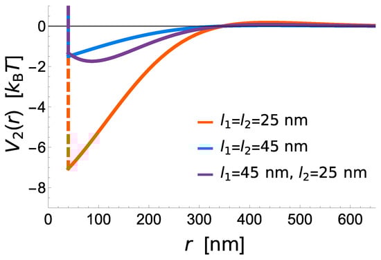Interaction potentials between two bonds of varying lengths and . Asymmetric bonds with unequal rest lengths show an additional repulsion, as the bonds work against each other in trying to pull the membrane to different heights. However, as the membrane height relaxes around a bond inducing strong deformations, there is a distance at which bonds inducing little membrane deformation can preferentially attach, resulting in a potential minimum that is shifted outwards compared to symmetric bonds.