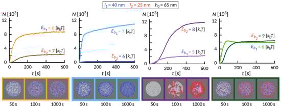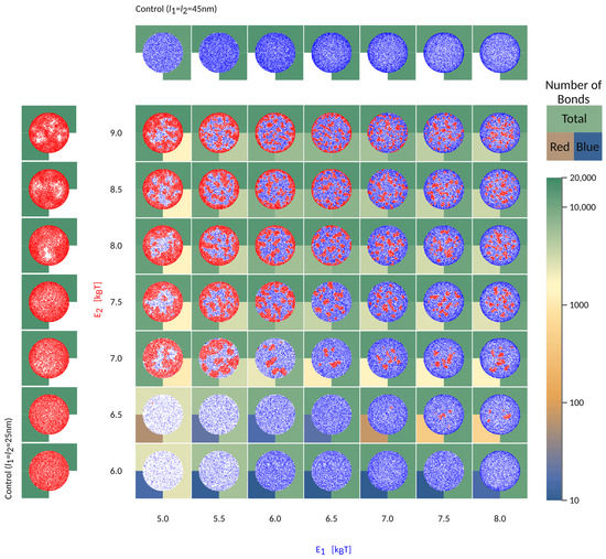 To further understand the segregation of bonds into domains in the contact zone, we focus on a system where nm nm, but start varying systematically the intrinsic strength of binding of the two pairs, as shown in Figure 5.