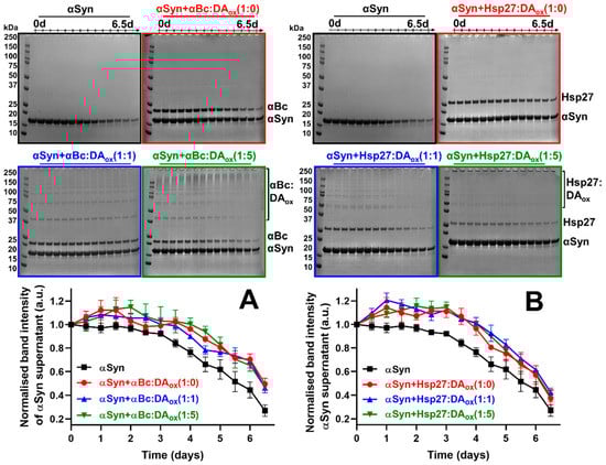 The alanine to threonine point mutation at position 53 (A53T) in αSyn has been identified in patients with familial PD []. Under physiological conditions, A53T αSyn aggregates to form amyloid fibrils at a faster rate than the wild-type protein [,]. The aggregation of A53T αSyn was monitored over 6.5 days by SDS-PAGE, in the absence and presence of the native and DAox-modified sHsps at a 10:1 molar ratio of A53T αSyn to the native sHsp or the sHsp modified with an equivalent or five-fold molar excess of DAox (e.g., αBc:DAox (1:5)). The complete gels for the time course of A53T αSyn aggregation in the presence of native and DAox-modified sHsps are presented Figure 1A,B. As described above, in all cases, the band associated with soluble A53T αSyn (at ~14 kDa in mass) decreased with time. The other bands arise from αBc at ~20 kDa and Hsp27 at ~27 kDa along with their oligomeric forms (dimer, trimer, tetramer, etc.) due to cross-linking associated with reaction with DAox. Large aggregates were present at the top of the gel which most likely arise from fibrillar A53T αSyn species and aggregated sHsps (more below). None of the gels exhibited intermediate species associated with A53T αSyn aggregation. Consistent with this, during chaperone action, our studies have shown that sHsps interact with the monomeric form of the target protein to prevent its association to form high molecular weight (HMW) species (e.g., [,]). When complete inhibition of the aggregation of an amyloid fibril-forming target protein (e.g., αSyn) occurs during chaperone interaction with sHsps, there are no HMW species formed, including a complex between the two [].