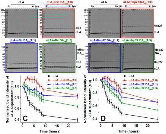 The effect of modification of αBc and Hsp27 by DAox on their chaperone activity against fibrillar and amorphously aggregating target proteins. 100 μM of A53T αSyn with or without DAox-modified 10 μM αBc (A) or Hsp27 (B) was allowed to aggregate in 50 mM phosphate, 150 mM NaCl, pH 7.4 at 37 °C with shaking at 1500 rpm, in a total volume of 300 μL. Every ~12 h, the sHsp and αSyn co-incubation was centrifuged at 19,391 rcf for 15 min at room temperature. A volume of 15 μL of the supernatant was flash frozen and run on SDS-PAGE in a chronological order of time under standard conditions. The band at ~14 kDa in (A,B) reflects soluble monomeric αSyn and are data from one of the replicates. The band intensity was quantified using ImageJ software. The αSyn band intensity at each time point was normalized relative to the band intensity at 0 h. The data represent the average of three replicates. Error bars represent the standard error of the mean. 100 μM Apo αLA with or without DAox-modified 4 μM αBc (C) or Hsp27 (D) was allowed to aggregate in 50 mM phosphate, 100 mM NaCl, 2.5 mM EDTA, pH 7.4 at 37 °C with shaking at 200 rpm. Every 45 min, the sHsp and αLA co-incubation was centrifuged at 19,391 rcf for 15 min at room temperature. A volume of 20 μL of the supernatant was flash frozen, and run on SDS-PAGE in a chronological order of time under standard conditions. The bands displayed in (C,D) reflect soluble monomeric αLA at ~14 kDa. The band intensity was then quantified using ImageJ software. The αLA band intensity at each time point was normalized relative to the band intensity at 0 h. The data represent the average of three replicates. Error bars represent the standard error of the mean.