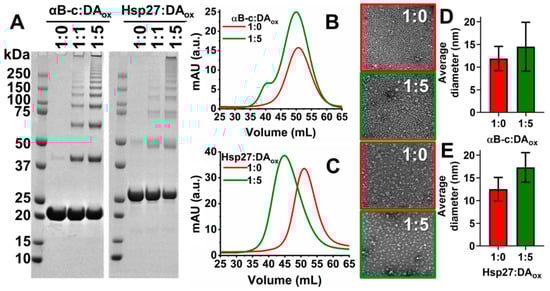 Characterization of DAox-modified sHsps. (A) 15 μM of αBc or Hsp27 was incubated with 0, 15 or 75 μM of DA in 50 mM phosphate, 150 mM NaCl at pH 7.4 for 24 h at 37 °C. Subsequently, the excess DAox was removed by subjecting the sHsp and DAox to co-incubation in a 10 kDa cut-off centrifugal filter. This process was repeated five times with the same buffer. The protein was then run on SDS-PAGE. These gels are representative of at least three repeats. A volume of 1 mL of 40 μM of αBc (B) or Hsp27 (C) was reacted with 0 or 200 μM DA in 50 mM phosphate, 150 mM NaCl, pH 7.4 for 24 h at 37 °C. The samples were loaded on a HiPrep 16/10 Sephacryl S-300 HR gel filtration column, with a column volume of 120 mL and a molecular mass fractionation range of 10–1500 kDa. Negatively stained transmission electron microscopy (TEM) images of 30 μM αBc (D) and Hsp27 (E) when incubated with 0 or 150 μM DAox. The diameter of 12 particles was measured per image using ImageJ software with nine images acquired per condition. The error bars represent the standard deviation.
