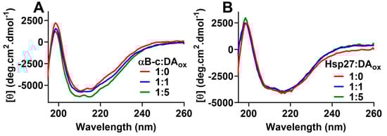 Characterization of sHsps:DAox using fluorescence spectroscopy, both intrinsic (i.e., fluorescence of the two tryptophan residues in the NTR of αBc) and extrinsic (i.e., 8-anilinonaphthalene-1-sulfonic acid (ANS) fluorescence to monitor exposed hydrophobicity), was not possible due to interference from the fluorescence of the incorporated DAox cross-links in the sHsps (Supplementary Figure S5). However, far-UV circular dichroism (CD) spectroscopy was used to monitor the effects of DAox on the overall secondary structure of the sHsps. The β-sheet-rich ACD of αBc interacts with amyloid-fibril forming proteins to prevent their aggregation []. Native sHsps have a CD spectrum indicative of the presence of significant anti-parallel β-sheet within the ACD, i.e., a positive peak at ~198 nm and a broad negative minimum at ~218 nm [,]. When both sHsps were modified with DAox, there was no substantial change in the overall CD spectrum (Figure 3A,B), consistent with a retention of the β-sheet secondary structure in the ACD of αBc and Hsp27.