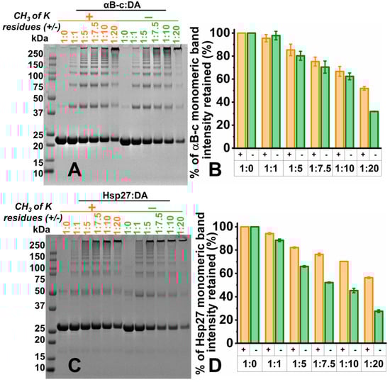 The lysine residues of αBc and Hsp27 were selectively dimethylated. The dimethylation of all lysine residues (and the amino terminus) of both sHsps was confirmed by mass spectrometry (Supplementary Table S1). The methylated sHsps were reacted with DAox, as described above, to determine whether the sHsp lysine residues were involved in DAox-mediated cross-linking (Figure 4). To determine the extent of cross-linking and hence HMW oligomerization induced by DAox, the monomeric band intensity in SDS-PAGE was quantified. The intensity of the monomeric band retained upon modification was compared with that of the monomeric band intensity of the unmodified sHsps. For both methylated and non-methylated (native) sHsps, a gradual loss of the monomeric band intensity (and hence an increase in HMW species) was observed as the concentration of DAox increased. Methylated αBc retained comparable monomeric band intensities to its non-methylated counterpart up to a 10-fold molar excess of DAox. At a 20-fold molar excess of DAox, substantially more monomer was retained for methylated αBc compared to its non-methylated counterpart (Figure 4A,B). Methylated Hsp27 retained comparable monomeric band intensities up to a molar equivalent of DAox. However, at a five-fold molar excess of DAox, substantially more monomer was retained for methylated Hsp27 (Figure 4C,D). Similar to methylated αBc, significantly more of the monomeric band was retained when the lysine residues were dimethylated in comparison to non-methylated Hsp27 upon reaction with a 20-fold molar excess of DAox. Overall, methylated Hsp27 was less susceptible to modification by DAox than methylated αBc. Thus, lysine methylation of the sHsps leads to less cross-linking due to reaction with DAox, particularly at higher ratios of sHsp:DAox, more so for Hsp27 than αBc. The implication is that lysine residues (via their ε-amino groups) are involved in reacting with DAox to form covalent cross-links resulting in HMW sHsp species.