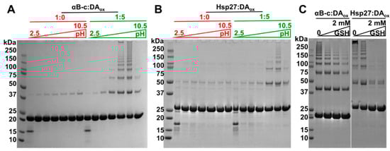 Acidic conditions and glutathione prevent formation of HMW, cross-linked sHsp species induced by DAox. SDS-PAGE of 20 μM of αBc (A) and Hsp27 (B) modified with or without a five molar excess of DAox was incubated over a pH range from 2.5 to 10.5. (C) SDS-PAGE of 20 μM αBc and Hsp27 incubated with a five molar excess of DAox and 0, 0.1, 1 or 2 mM GSH in 50 mM phosphate, 150 mM NaCl for 24 h at 37 °C. The GSH was added immediately prior to commencing the sHsp-DAox interaction.