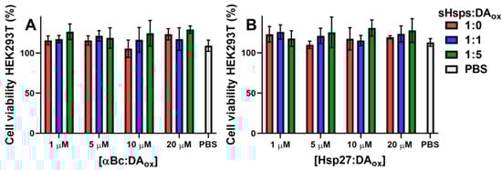Finally, the effect of sHsps:DAox on cell viability was investigated. When HEK293T cells, which possess neuronal-like characteristics due to the presence of neurofilaments, vimentin and other proteins characteristic of a cell line with neuronal lineage [], were treated with 1, 5, 10 and 20 μM of αBc:DAox (Figure 6A) or Hsp27:DAox (Figure 6B), there was no significant difference between cell viability in the presence of unmodified αBc or a phosphate-buffered saline (PBS) blank. The percentage values of cell viability were normalized to those of cells without sHsps or PBS added. The values in Figure 6 greater than 100% arise because the presence of sHsps increased cell viability relative to the controls, i.e., sHsps had a slight protective effect on the cells which is consistent with their ability as molecular chaperones to stabilize proteins. It is concluded that modification of sHsps with DAox did not induce cell toxicity over the experimental timeframe.