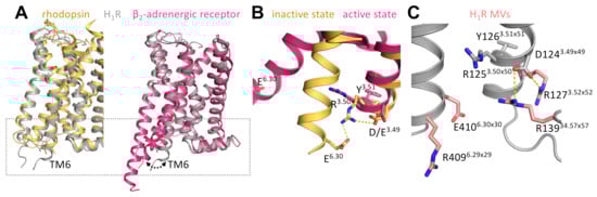 - Bakker, R.A.; Jongejan, A.; Sansuk, K.; Hacksell, U.; Timmerman, H.; Brann, M.R.; Weiner, D.M.; Pardo, L.; Leurs, R. Constitutively active mutants of the histamine H1 receptor suggest a conserved hydrophobic asparagine-cage that constrains the activation of class A G protein-coupled receptors. Mol. Pharmacol. 2008, 73, 94–103. [Google Scholar] [CrossRef] [PubMed]