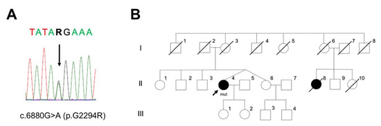 PD case with LRRK2 p.G2294R and her family pedigree. (A) Sanger sequencing found a heterozygous missense variant, NM_198578.4: c.6880G > A (p.G2294R). A, Adenine; T, Thymine; G, Guanine; R, purine (A or G). (B) The family pedigree of a patient with LRRK2 p.G2294R. Black arrow, proband; square, male; circle, female; oblique line, deceased; black-colored circles, clinically diagnosed with PD. II-4 and II-6 were monozygotic twins. II-8 was not assessed by genetic testing.
