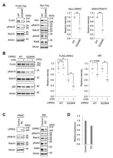 LRRK2 is destabilized by the p.G2294R variant. (A) The protein levels of LRRK2. Lysate from HEK293T cells transiently transfected with FLAG-LRRK2 (left) or Myc-LRRK2 (right) was analyzed by Western blot with indicated antibodies. The graphs (bars represent the mean; white circles indicate each value) represent relative Myc-LRRK2 levels normalized with ß-actin, and the ratio of pRab10 to total Rab10. Note that the anti-pRab8 we used crossreacts with pRab3, pRab10, and pRab35 [14]. n = 3 biological replicates; Student’s t-test. ß-actin served as a loading control. pRab10 and Rab10 phosphorylated at T73; pRab8, Rab8 phosphorylated at T72. (B) LRRK2 p.G2294R is unstable. HEK293T cells transiently transfected with FLAG-LRRK2 WT or p.G2294R were treated with (+) or without (−) 100 µg/mL cycloheximide (CHX) for 8 h and analyzed by Western blot. The left graph shows that the relative LRRK2 intensity normalized with ß-actin was decreased by p.G2294R mutation, which was further accelerated by CHX treatment. The right graph shows the relative p62 intensity normalized with ß-actin. The data (bars represent the mean; white circles indicate each value) are from 3 biological replicates; Student’s t-test. n.s., not significant. (C) The endogenous protein levels of LRRK2 and the indicated proteins in PBMCs and macrophages (Mø) from the PD patient with LRRK2 p.G2294R, and a normal control. (D) The relative quantification of endogenous LRRK2 normalized with ß-actin in Mø.