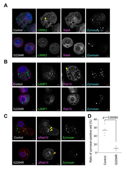 The phagocytic activity of the macrophages was analyzed using zymosan prepared from yeast cell wall as a model of fungi (Figure 3 and Supplementary Figure S3). The acidification of the phagosomes, as assessed by the uptake of pH-sensitive fluorescent (pHrodo) zymosan bioparticles, was impaired in the macrophages from the PD patient with LRRK2 p.G2294R (Figure 3D). Although the subcellular distribution of LRRK2, Rab8, and LAMP1 was not markedly different between the normal control and LRRK2 p.G2294R (Figure 3A,B), the strong accumulation of phospho-Rab10 signals was frequently observed in the control macrophages but not in the LRRK2 p.G2294R macrophages (Figure 3C).