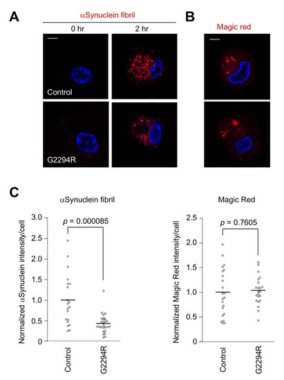 Uptake of α-synuclein fibrils is impaired by p.G2294R variant. (A) Macrophages differentiated from monocytes were treated with α-synuclein fibrils conjugated with AcidiFluor ORANGE for 2 h. The fluorescence of α-synuclein fibrils activated in low-pH endolysosomal vesicles (red) and nuclei (blue) was imaged. The scale bar is 5 µm. (B) The cathepsin B activity (red) in the macrophages was imaged using Magic Red substrate. The scale bar is 5 µm. (C) The quantification of phagocytosed α-synuclein fibrils and cathepsin B activity. The bars in the graphs represent the mean (n ≥ 20); Student’s t-test.