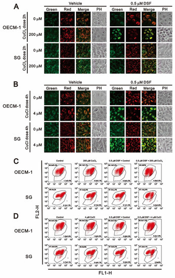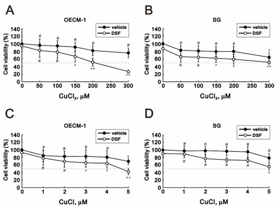 The cytotoxicity of copper and the DSF-Cu+/Cu2+ complexes has been reported previously [27,28,29]. We therefore applied MTT cell viability assays to assess the effects of Cu+, Cu2+, and the combination of DSF and Cu+ or Cu2+ on OECM-1 oral cancer cells and SG normal gingival epithelial cells [30]. We observed that medium supplemented with various concentrations of CuCl and CuCl2 induced concentration-dependent cytotoxicity in OECM-1 and SG cells (Figure 1). The combination of DSF with copper ion, especially Cu2+, dramatically increased the cytotoxicity toward OECM-1 cells (Figure 1A). The IC50’s for CuCl2 and CuCl were, respectively, 200 μM and 4.6 μM in OECM-1 cells (Figure 1A,C) and >300 μM and 5 μM in SG cells (Figure 1B,D).