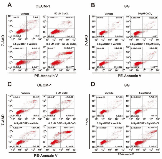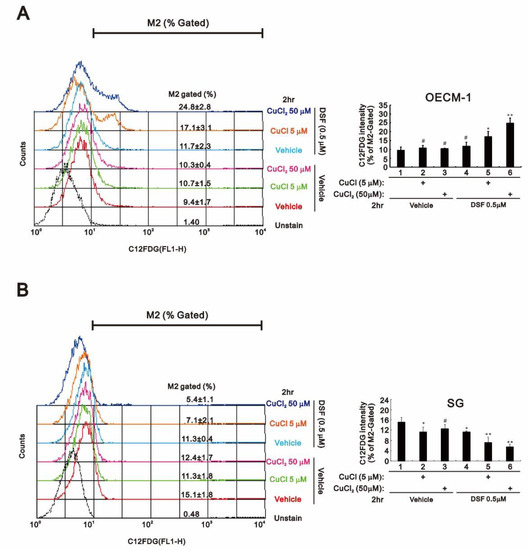 Annexin V apoptosis analysis revealed that the combination of DSF with CuCl2 or CuCl dramatically increased the incidence of late apoptosis, but not early apoptosis, among OECM-1 (Figure 3A,C). However, the combination of DSF with CuCl appeared to induce both early and late apoptosis in SG cells (Figure 3D). C12FDG senescence analysis showed that the combination of DSF with CuCl or CuCl2 dramatically increased the population of senescent OECM-1 cells (Figure 4A), whereas both combinations decreased the population of senescent SG cells (Figure 4B).