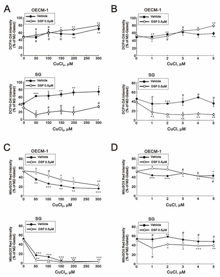 Effects of DSF, copper ions, and DSF-copper complexes on cytosolic and mitochondrial ROS in OECM-1 and SG cells. (A–D) OECM-1 (A,C) and SG (B,D) cells were treated for 2 h or 4 h with the indicated concentrations of Cu+ or Cu2+ in the absence or presence of 0.5 μM DSF, after which the live cells were stained with (A,B) 10 μM DCFH-DA for cytosolic ROS and (C,D) 5 μM MitoSOX red for mitochondrial ROS and assayed using a flow cytometer. The results are representative of three independent experiments. # p > 0.05, * p < 0.05, ** p < 0.01, and *** p < 0.001.