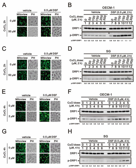 Effects of DSF, copper ions, and DSF-copper complexes on mitochondrial fission/fusion in OECM-1 and SG cells. OECM-1 and SG cells were treated for 2 h or 4 h with the indicated concentrations of Cu+ or Cu2+ in the absence or presence of 0.5 μM DSF, after which the live cells were stained with (A,C,E,G) 10 nM MitoView™. Cell lysates were subjected to Western blot analysis (B,D,F,H) using antibodies against DRP1 and p-DRP1. The results are representative of three independent experiments.